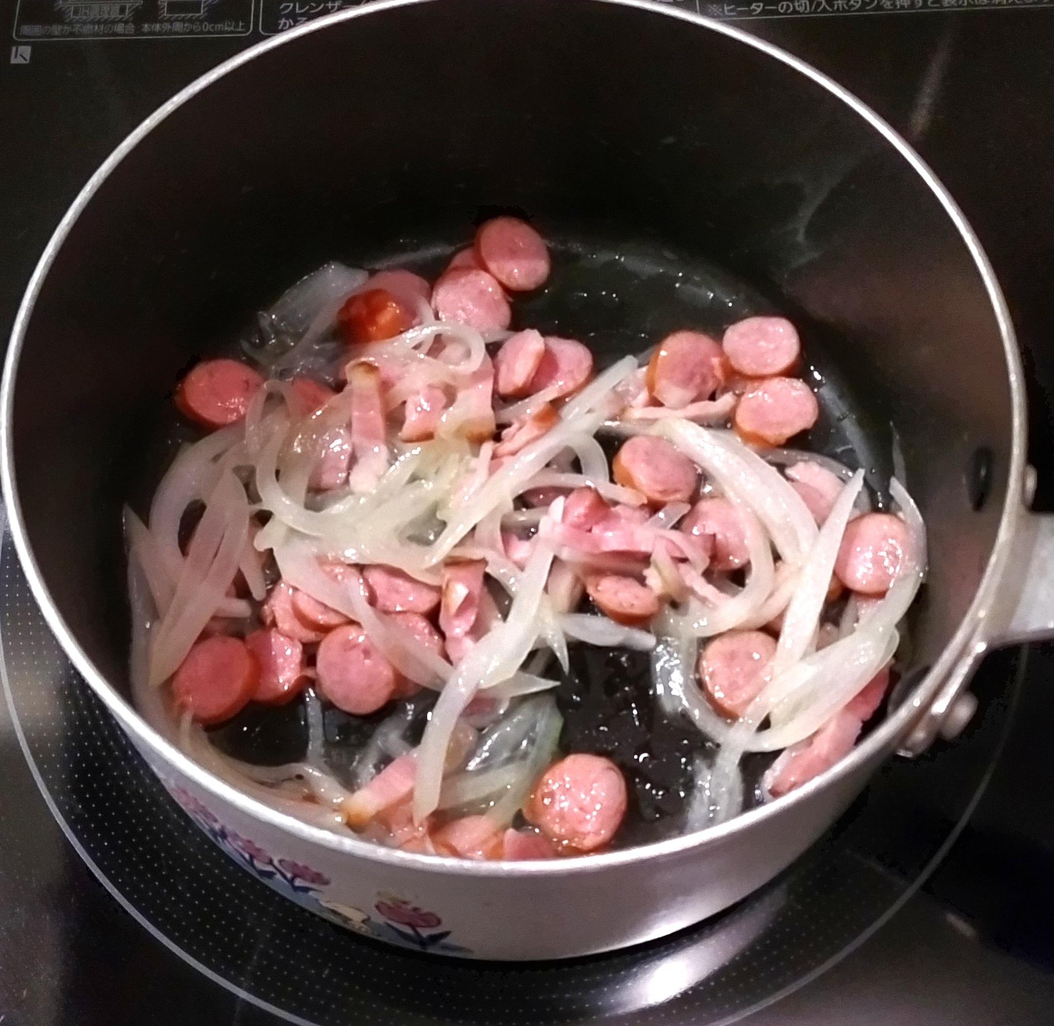 フライパンを熱してサラダ油をひき、ウインナーとベーコンと玉ねぎを炒める。