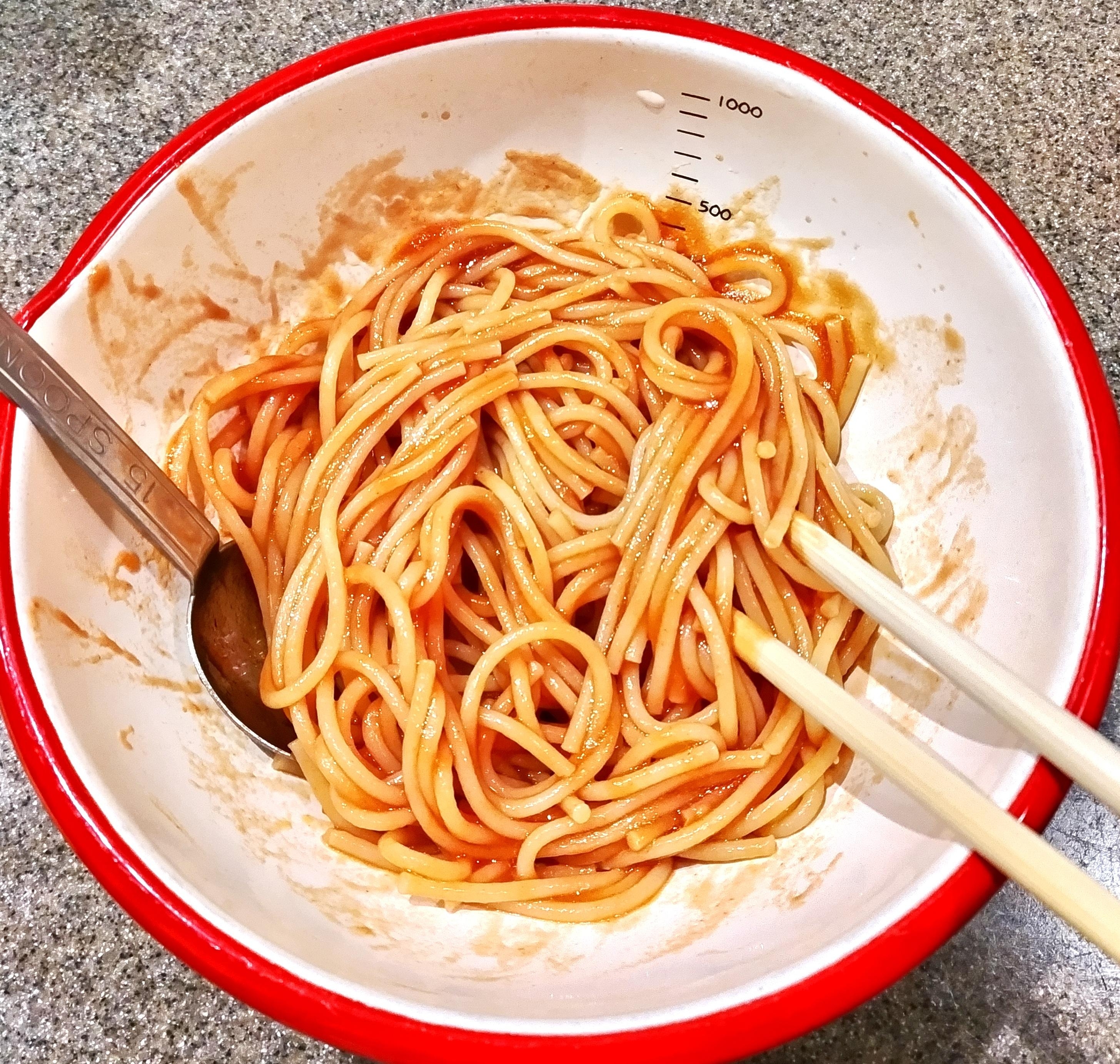 スパゲッティを袋の表示より2分長く茹で、茹で上がったら湯をきって●が入ったボウルに入れ、よく和える。