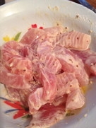 まんだいは親指くらいの太さのスティックに切り、パン粉とハニーマスタードソース以外の材料とよく混ぜる。