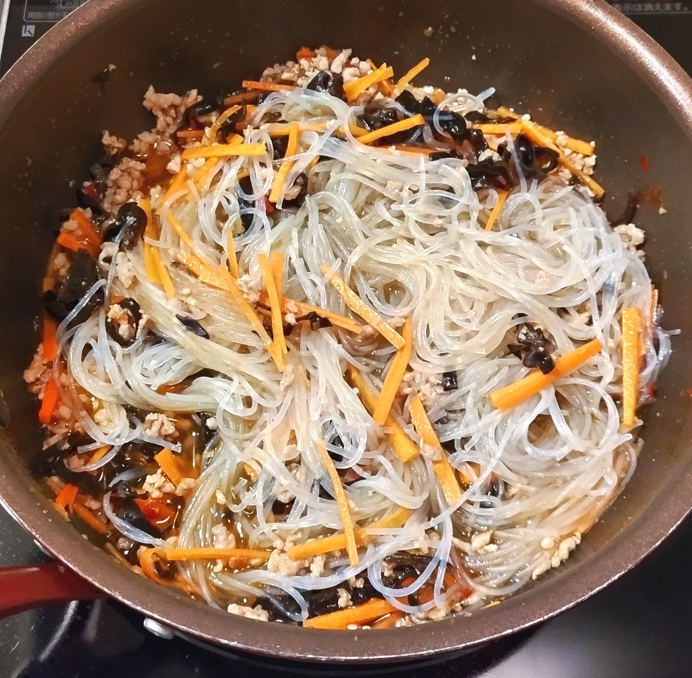 ひき肉に火が通ったら、きくらげと人参を加えて混ぜ合わせる。