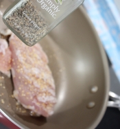 レモンペッパー(なければブラックペッパー)をふりかけて、皮をこんがりするまで3~4分焼きます。