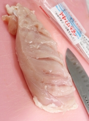 鶏胸肉は、皮目に包丁などで数か所切り込みを少し入れて(焼き縮み防止)