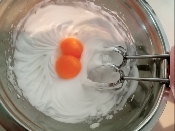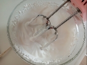 - 3 卵白をハンドミキサーで泡だて、白くなったら、上白糖①を加え、更にピンとツノが立つ程度に泡立てる。