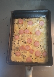 テフロン加工の卵焼き器にチーズを平らに入れて ウインナーソーセージを並べ入れて中火で加熱します。