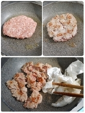 脂がじわじわ湧いてくるのでキッチンペーパーで吸い取りながら肉を崩す
