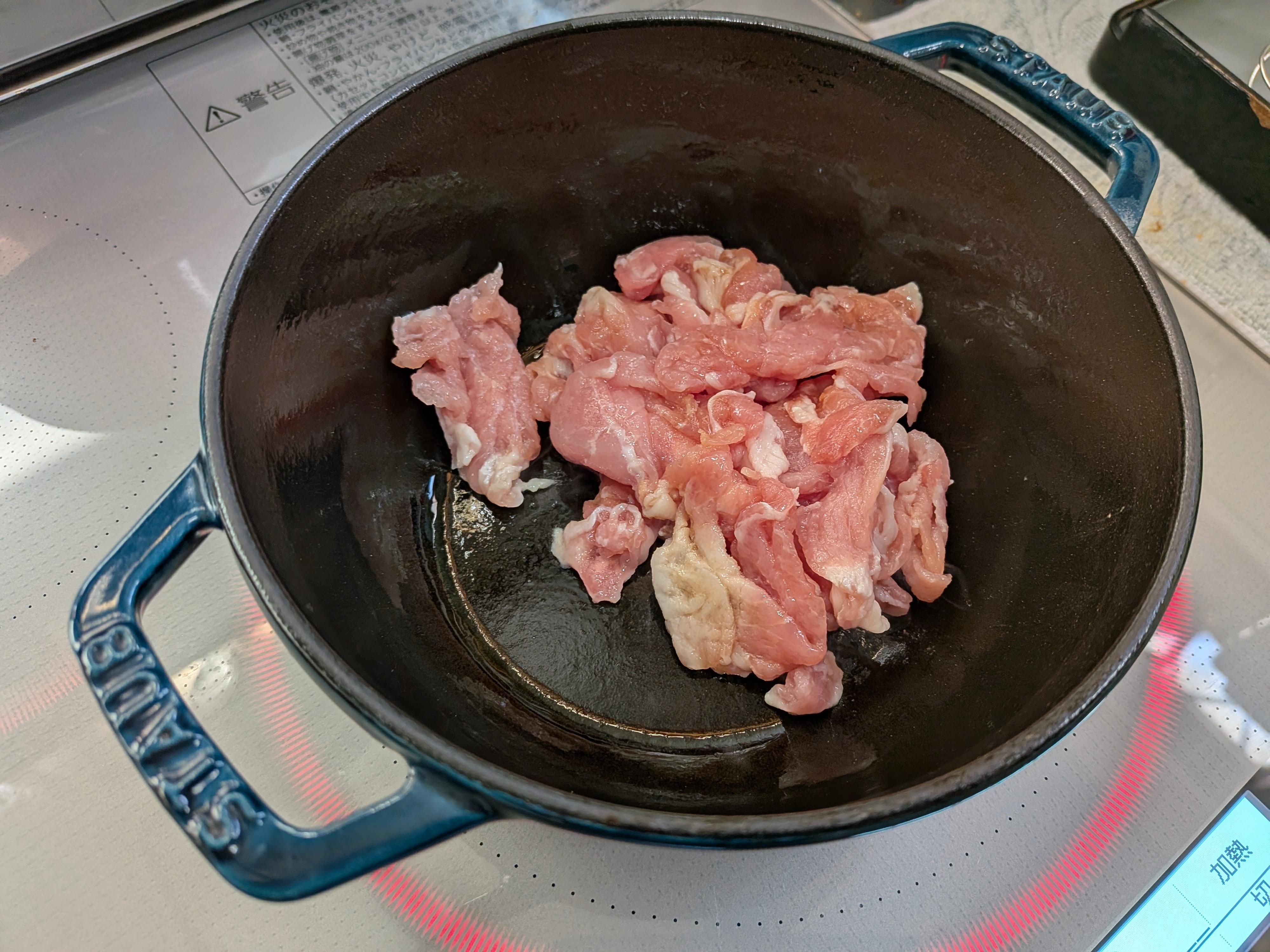 ✱豚こま肉を広げて置き下の部分に色がつくまで触らずに加熱