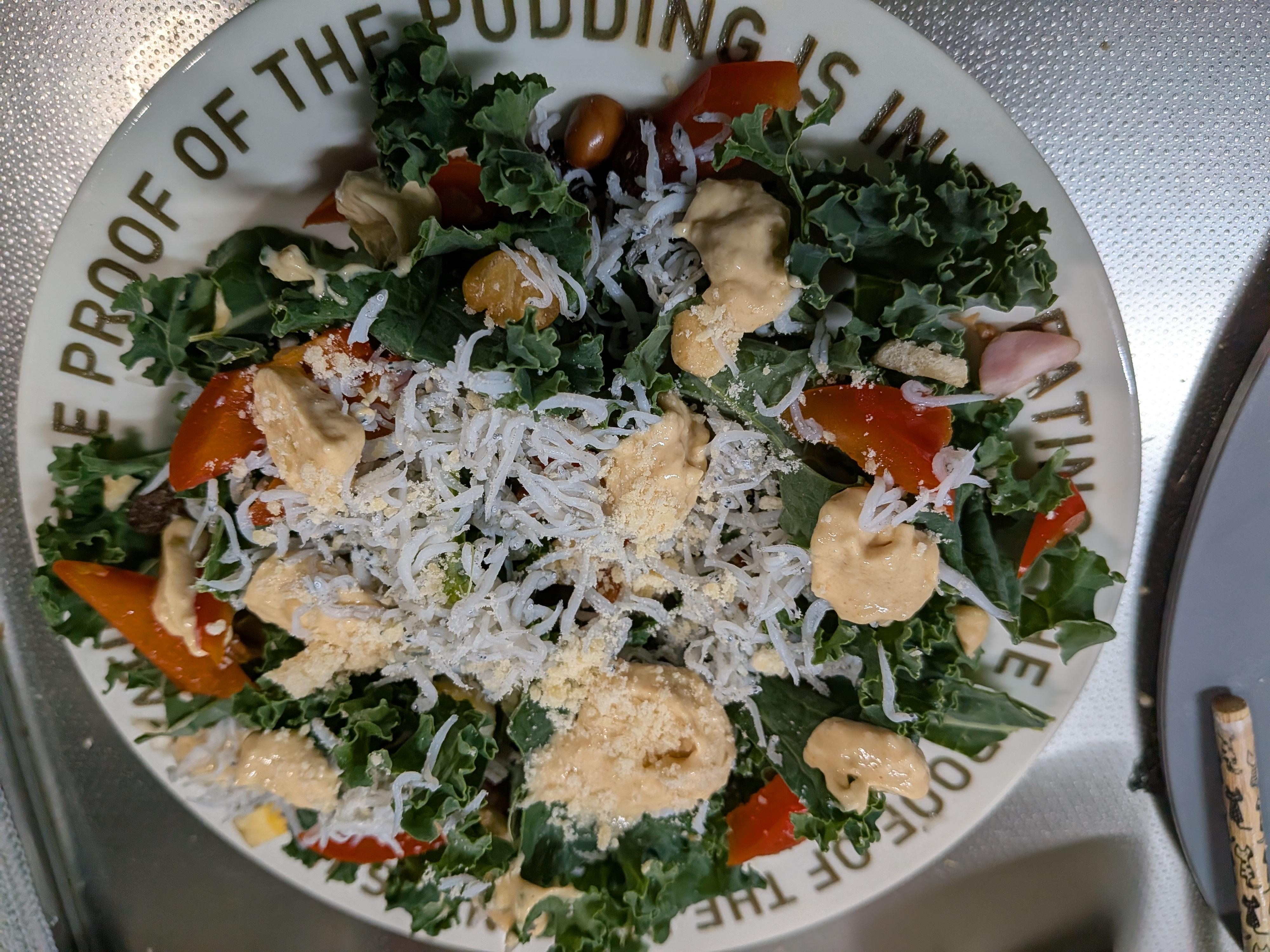 粉チーズときな粉合わせたら コク旨ドレッシング爆誕✧*。 ケールとしらすを合わせた パワーアップサラダ⤴