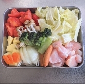 鶏もも肉・チョリソー・じゃがいも・しめじ・ブロッコリー・ミニトマト入れて人参をのせて煮込む。