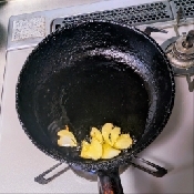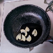 フライパンを斜めにして中火でニンニをこんがりと揚げる。