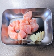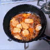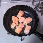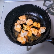 ニンニクを取り出したフライパンに鶏もも肉の皮目を下にして入れる。