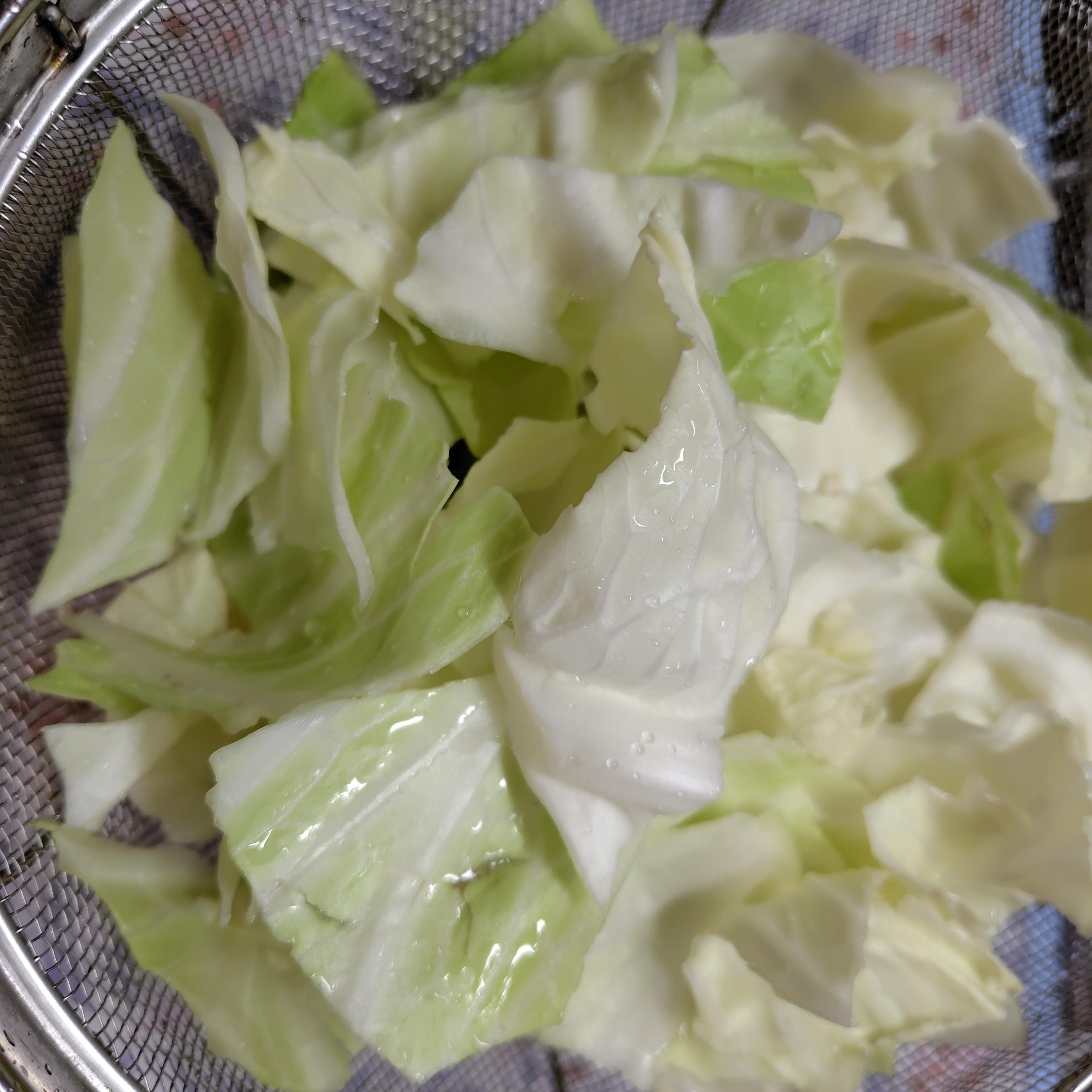 キャベツはざく切りにして、洗った水気をしっかり切ります。