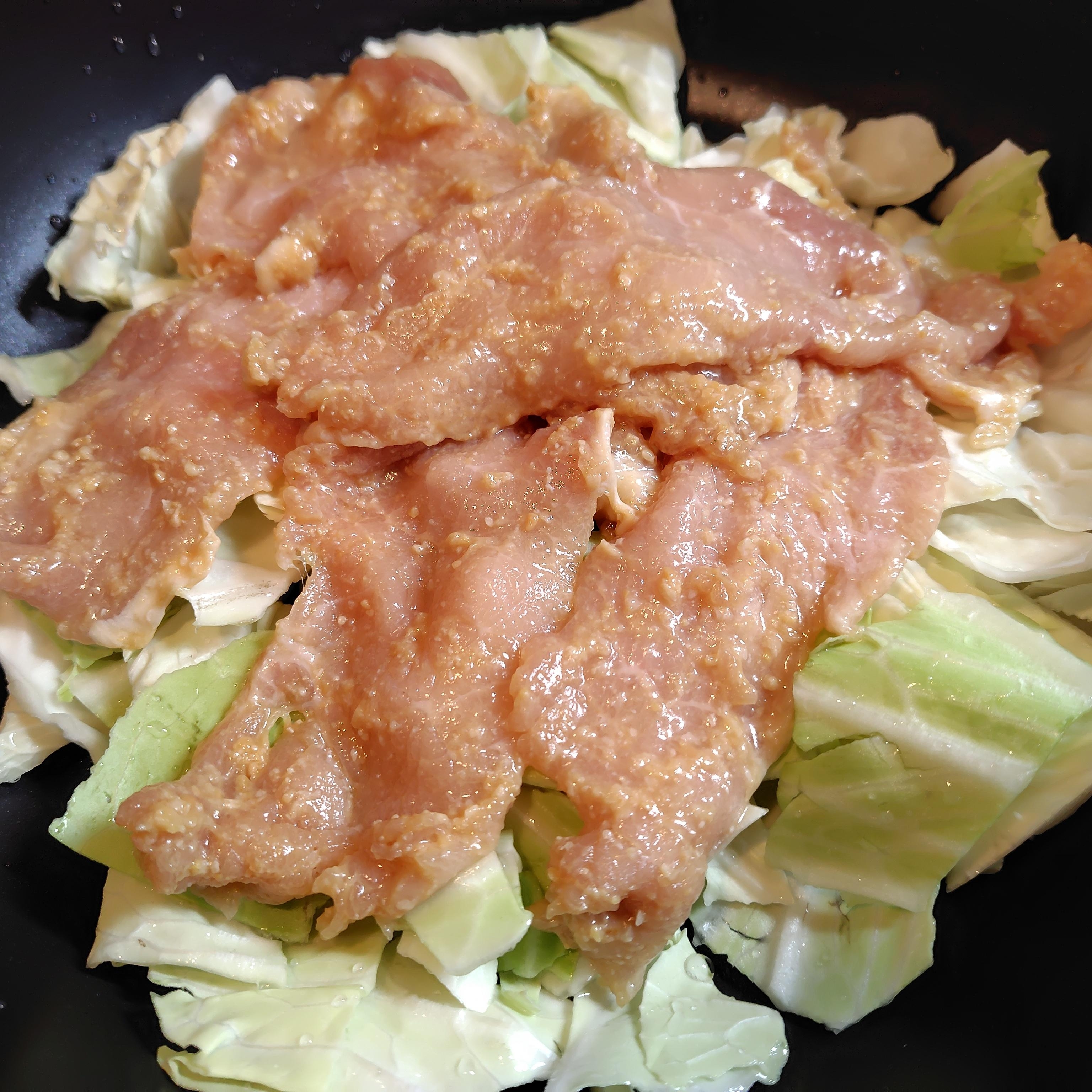 フライパンにキャベツを敷き、上に豚ロース薄切り肉を開いて乗せます。
