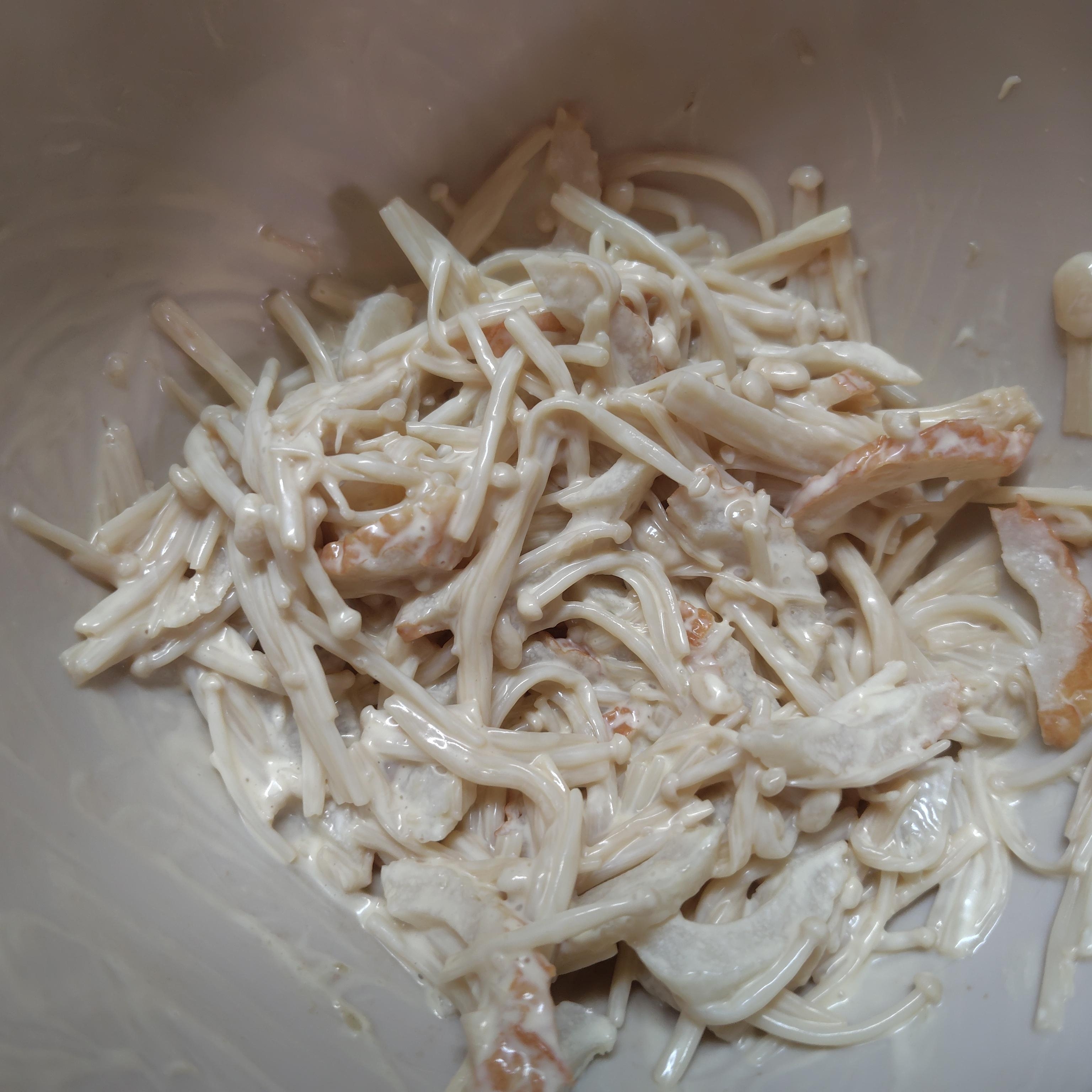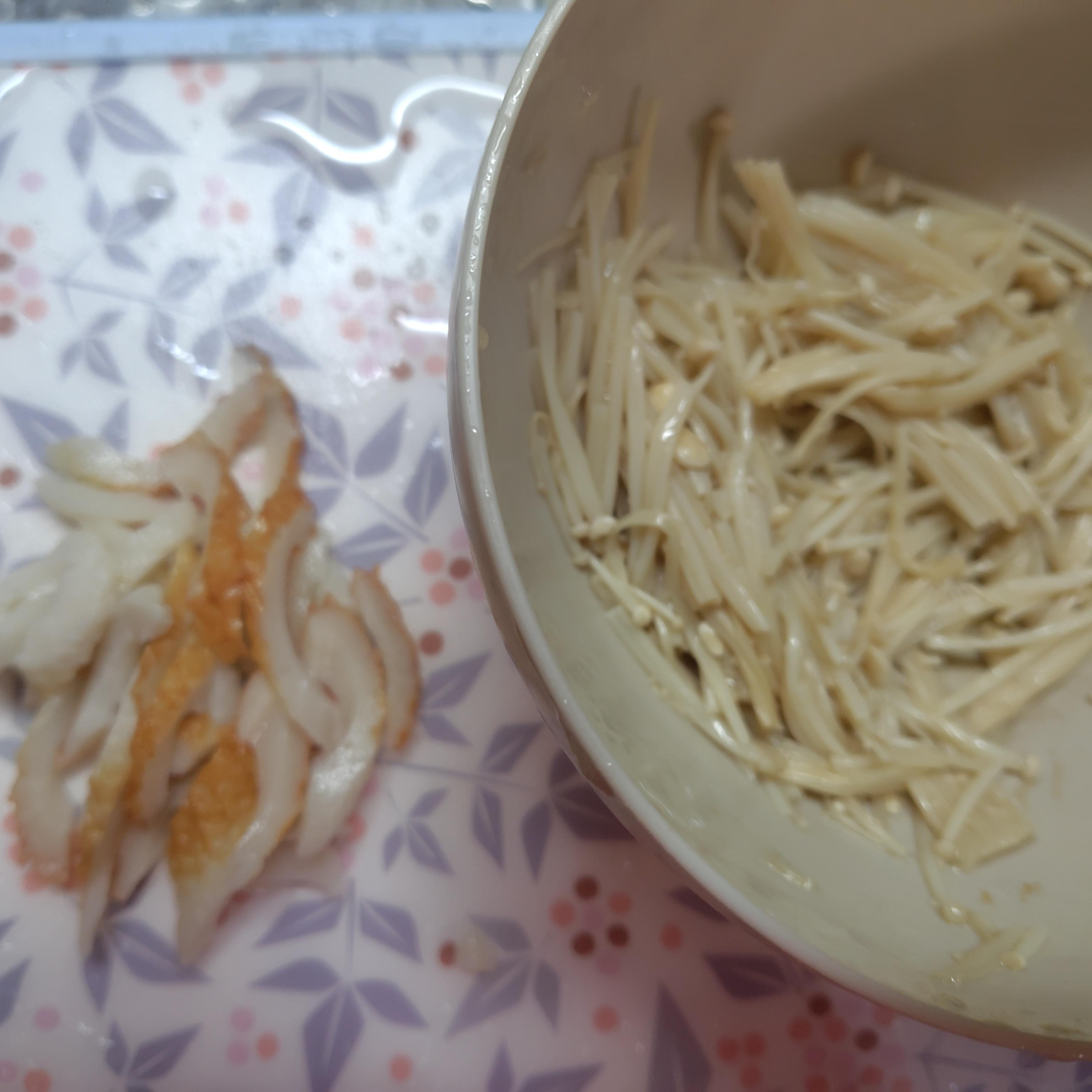 ○えのきは石づきを切り落とし、半分に切り手でほぐし、ふんわりとラップをし600wのレンジで2分加熱し、水気を切って粗熱を取ります。