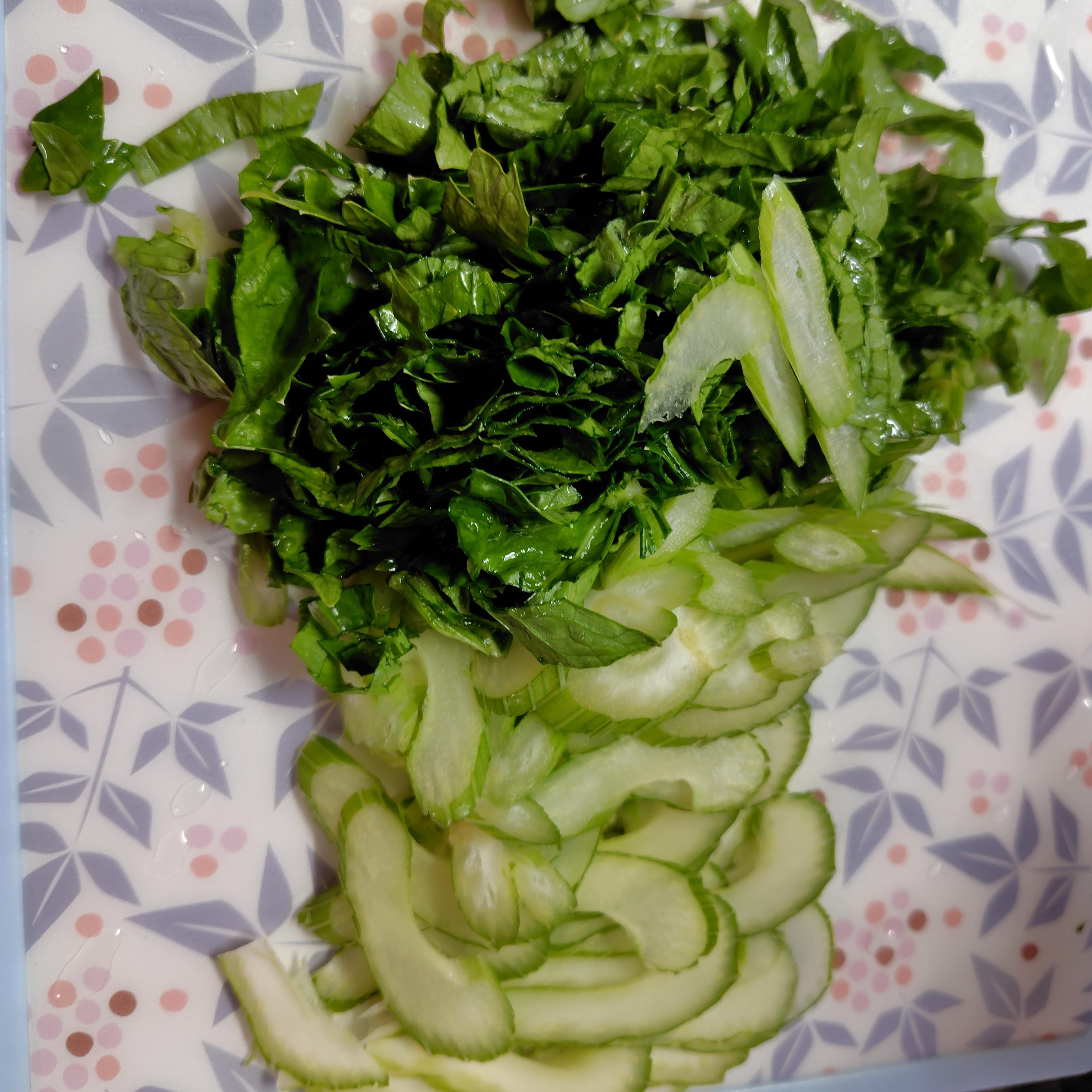 セロリはスジを取り、茎の部分は斜め薄切りに、葉っぱの部分は1センチ程度に切ります。