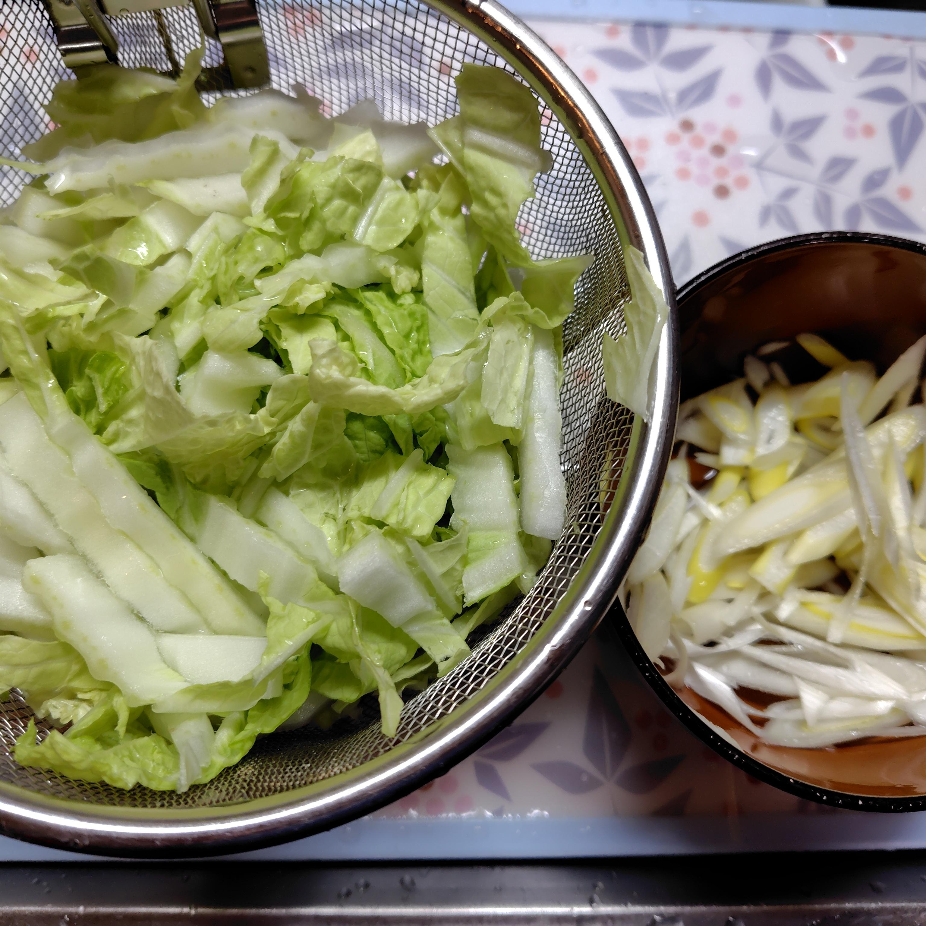 ○長ネギは斜め薄切りにし、軽く水にさらして水気をギュッと絞ります。