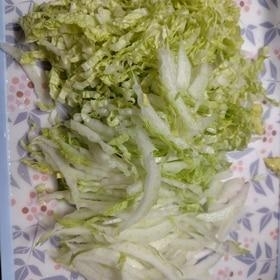 白菜は茎の部分は粗めの千切りに、葉の部分はザク切りにします。