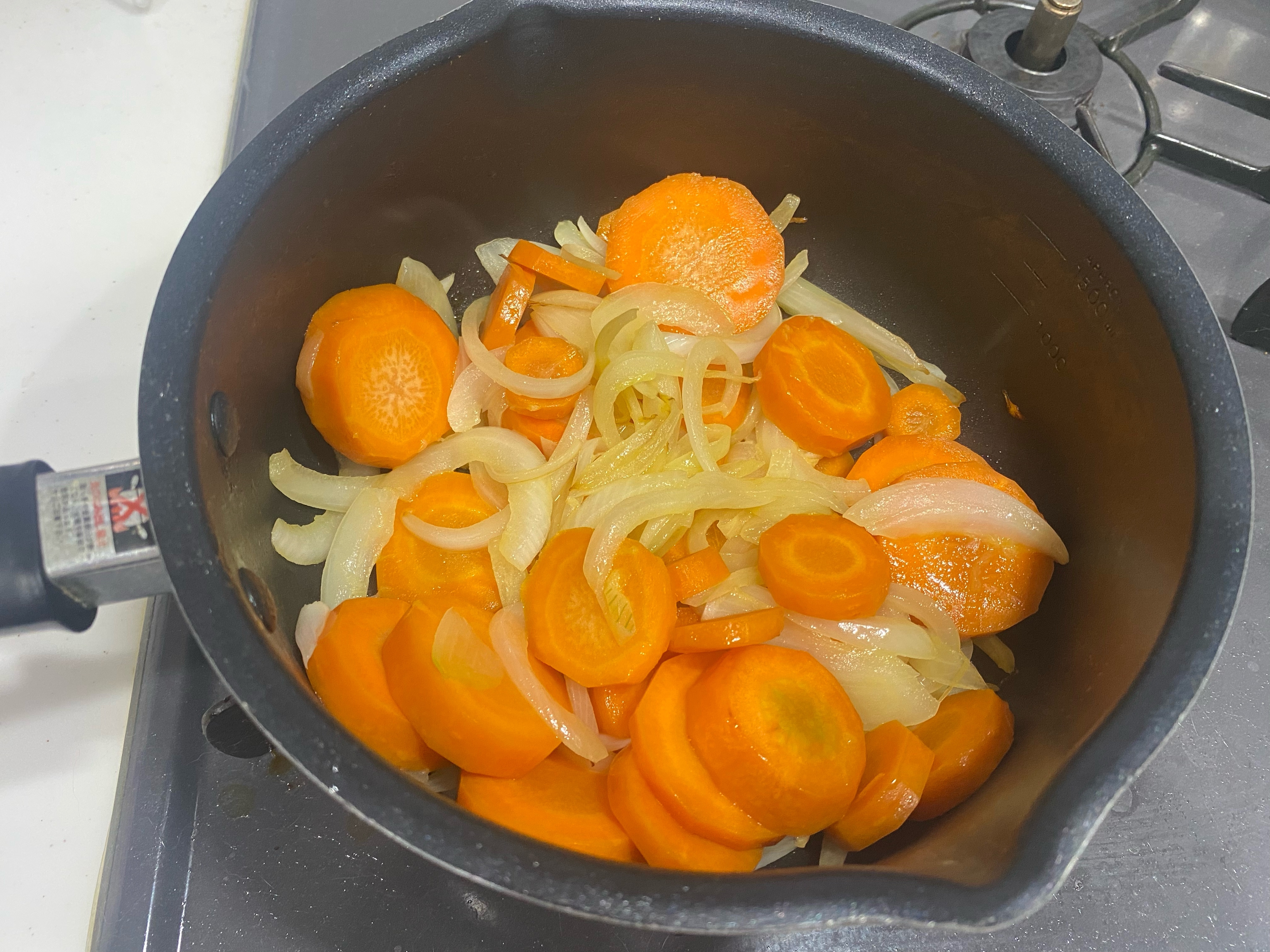 旨みが引き出されるよう、野菜をよく炒めてから水を加えました。 にんじんは香りが強いので、シナモン風味にしました。お好みで。