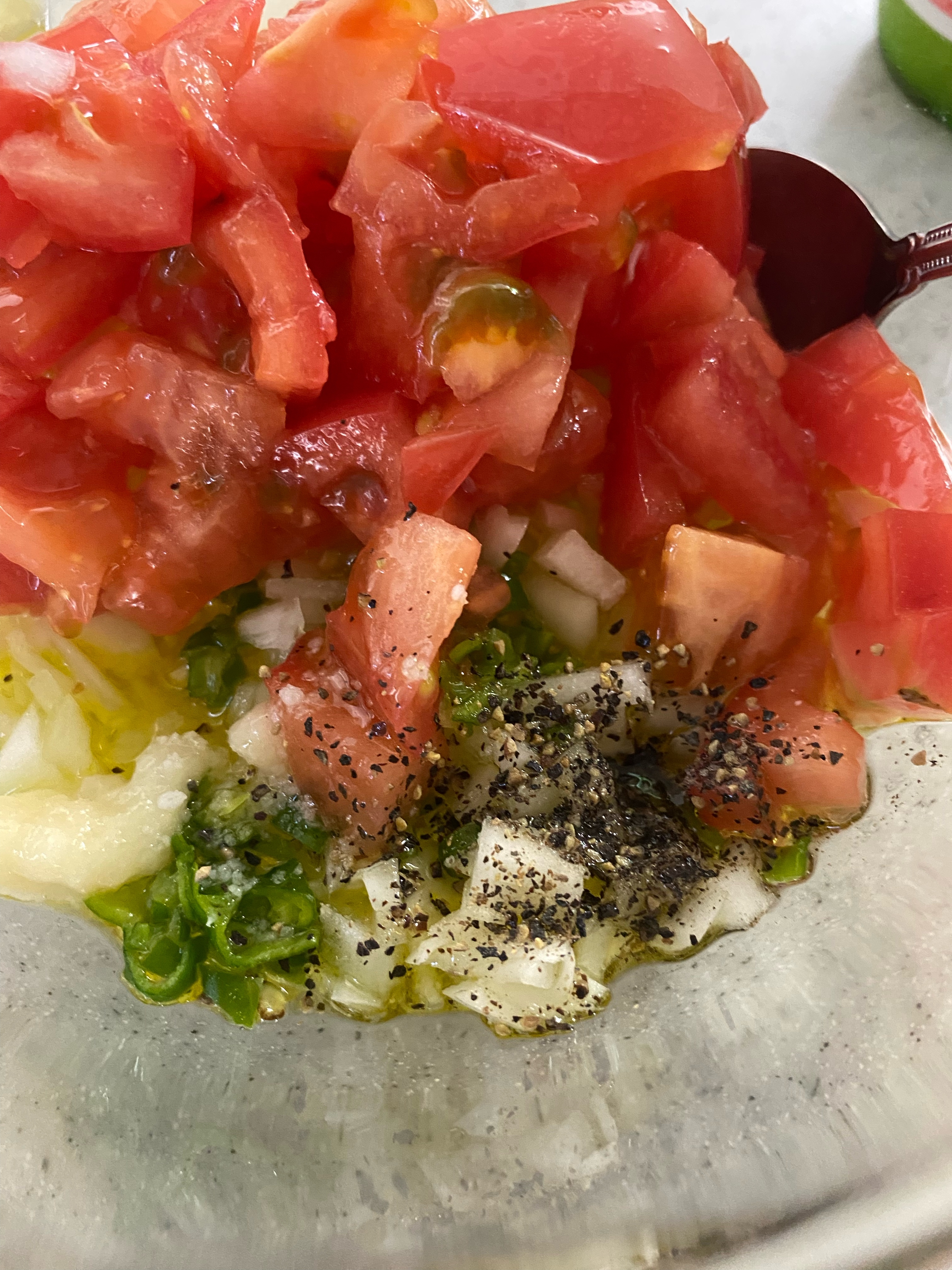みじん切りしたたまねぎ、トマト、万願寺とうがらしをボウルに入れる