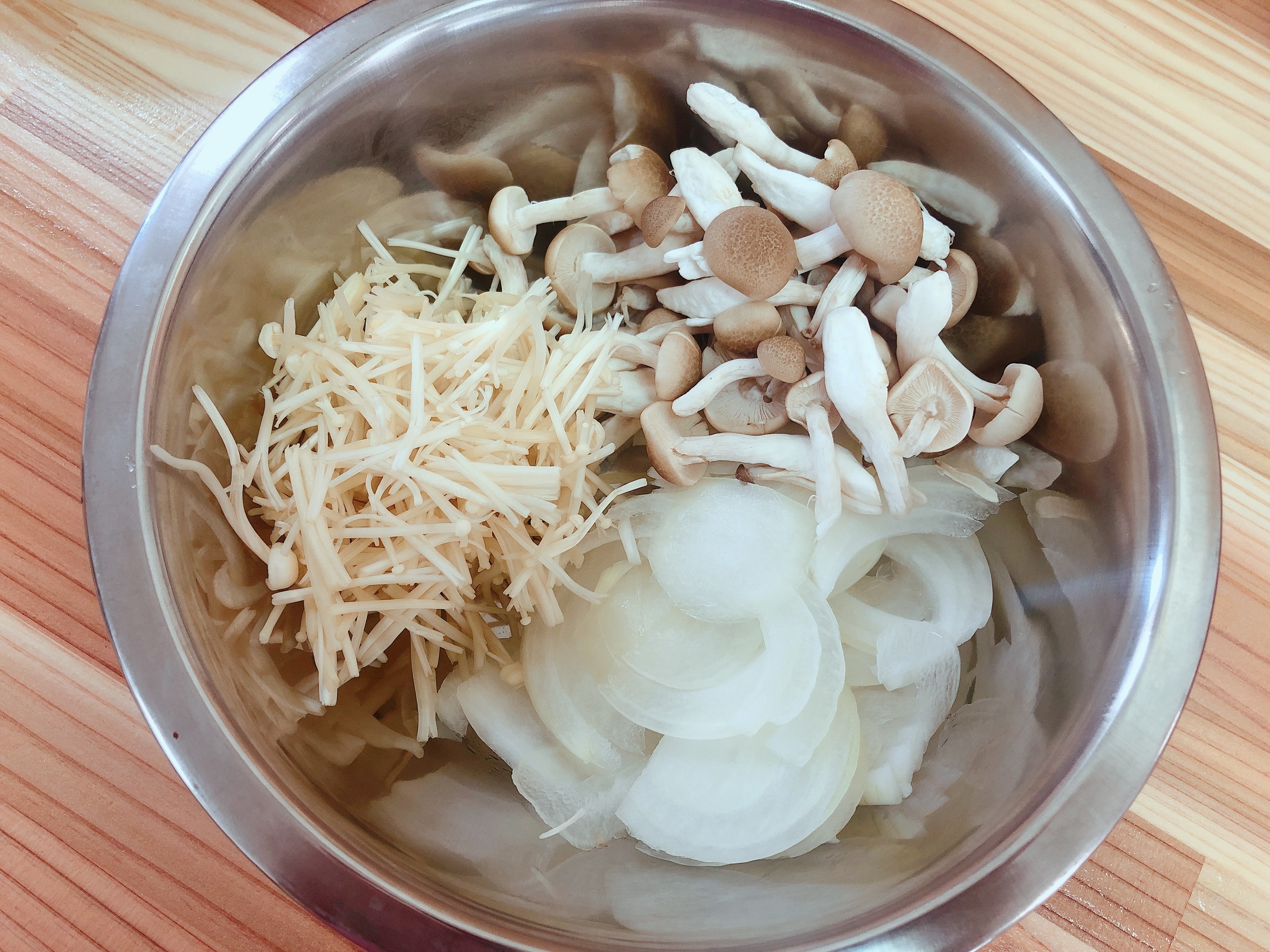 えのき・しめじは石づきを切り落とし、食べやすい大きさにほぐしておく。