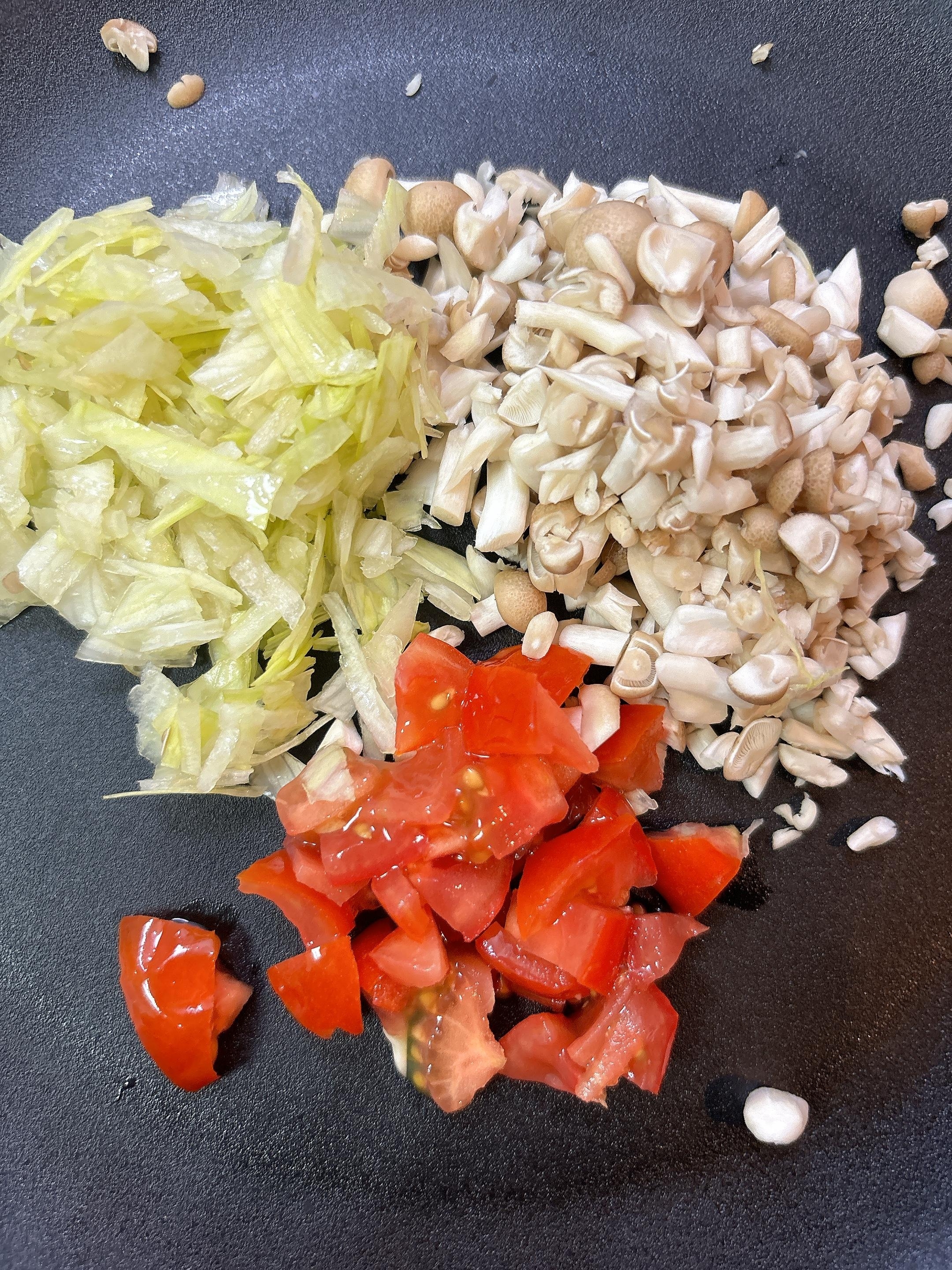 しめじは根元を切り落として細かく刻み、レタスはみじん切り、ミニトマトはお好みの大きさにカットする。