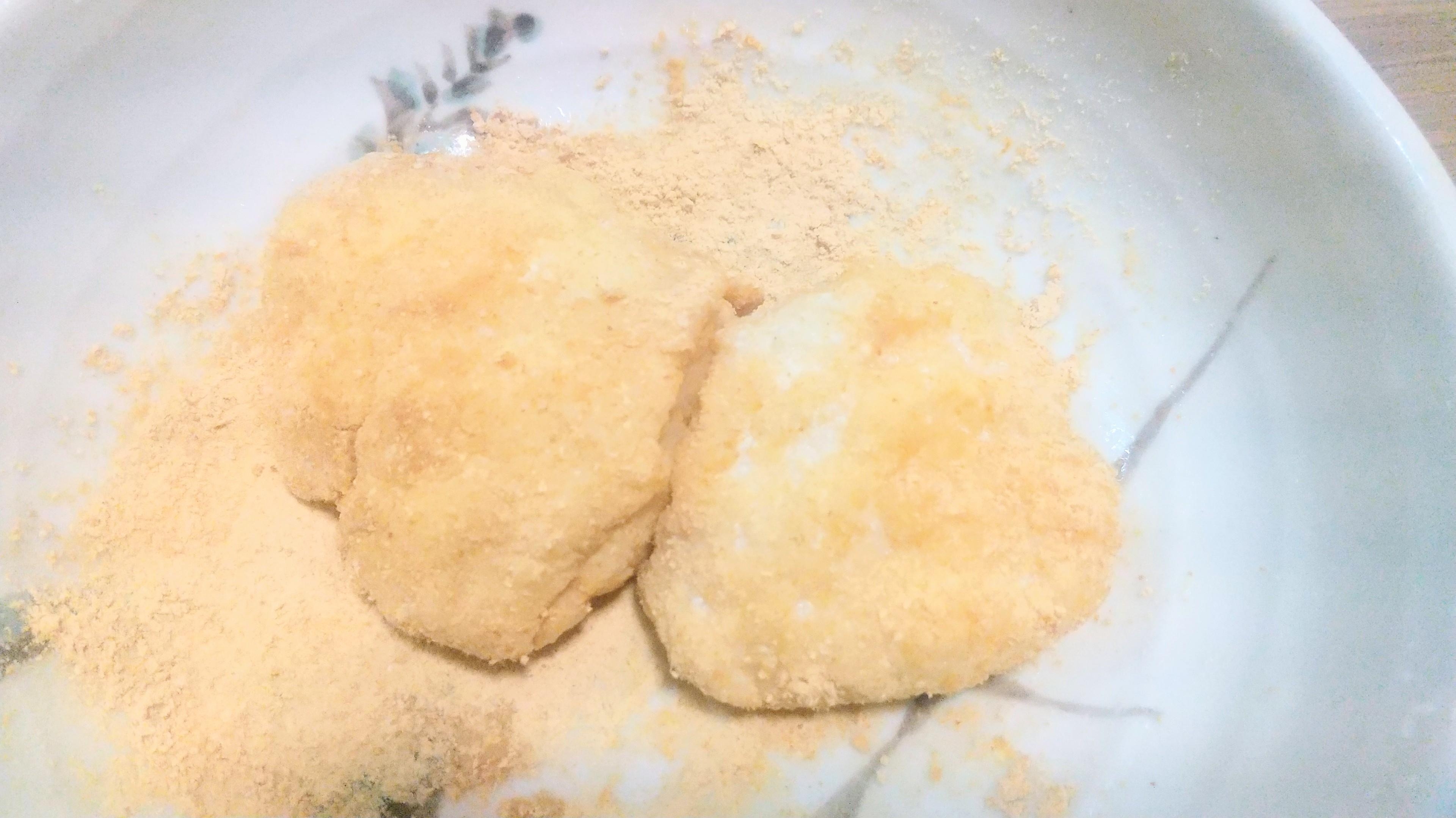 モチモチしたらokです。水で濡らしたスプーンですくいお皿に載せてきな粉をまぶして出来上がり♪