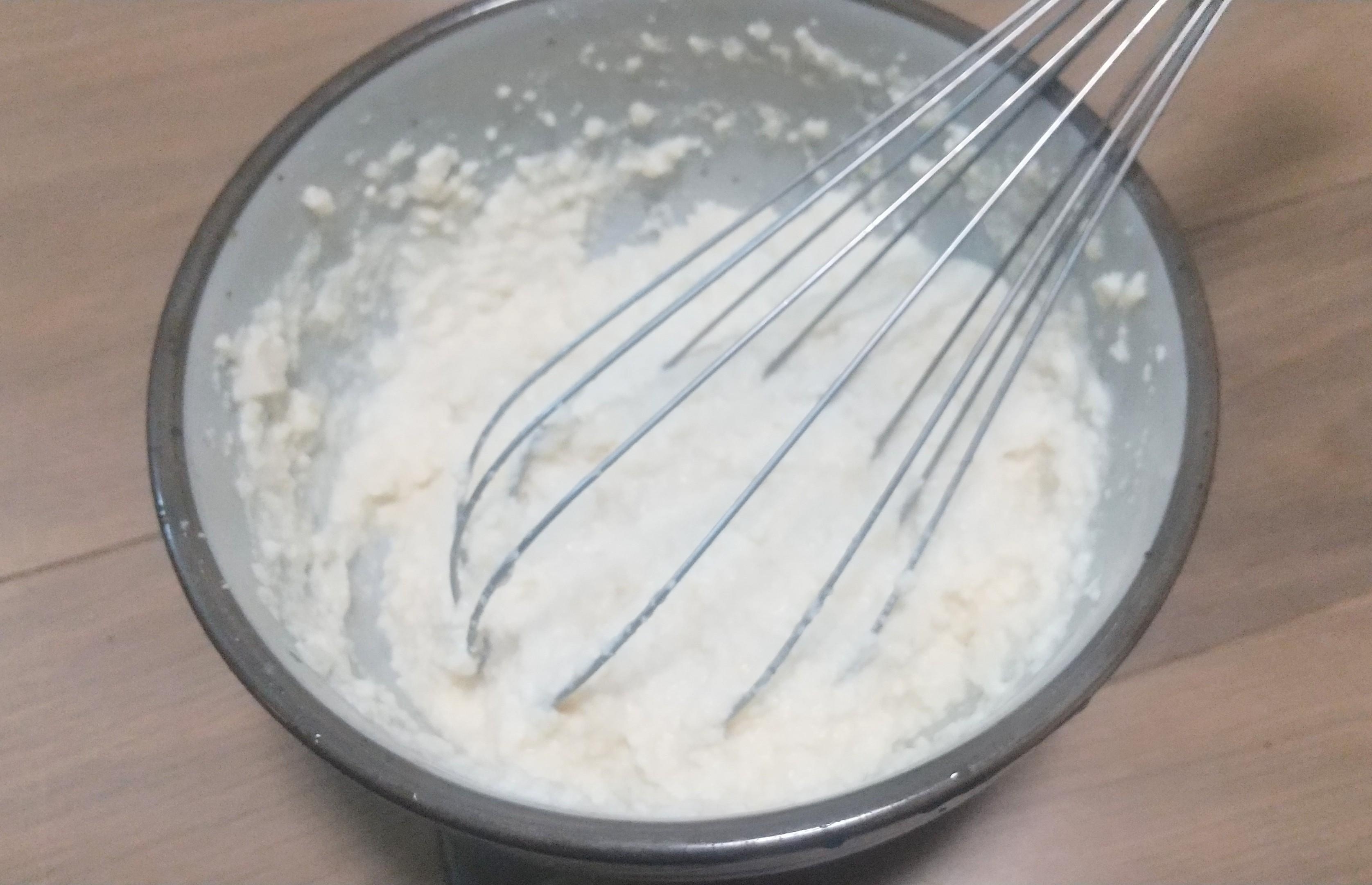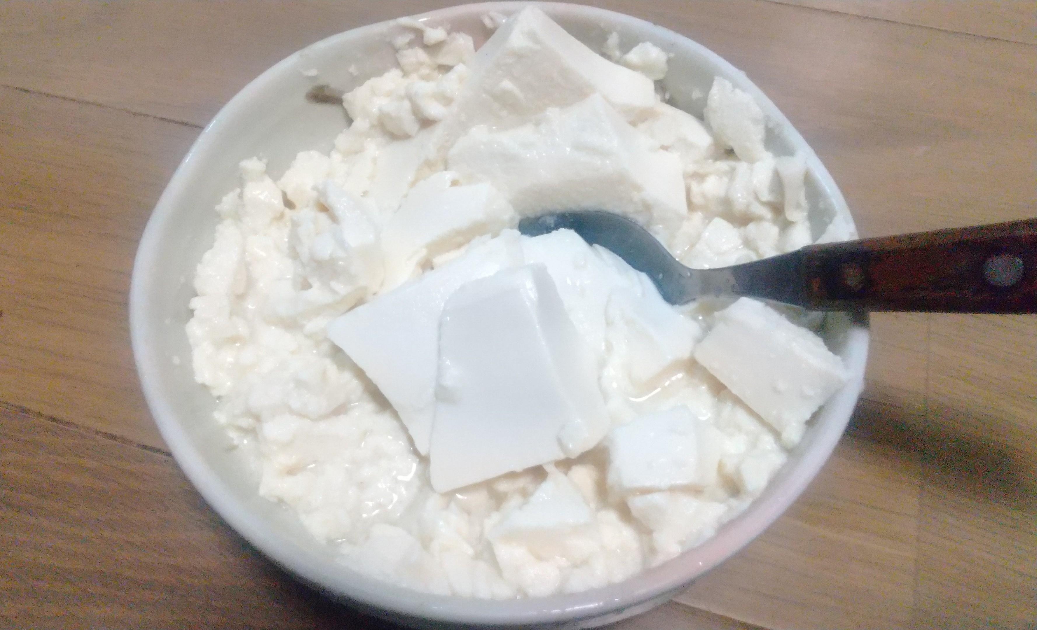 お豆腐を容器に入れ、細かくなるまで混ぜる