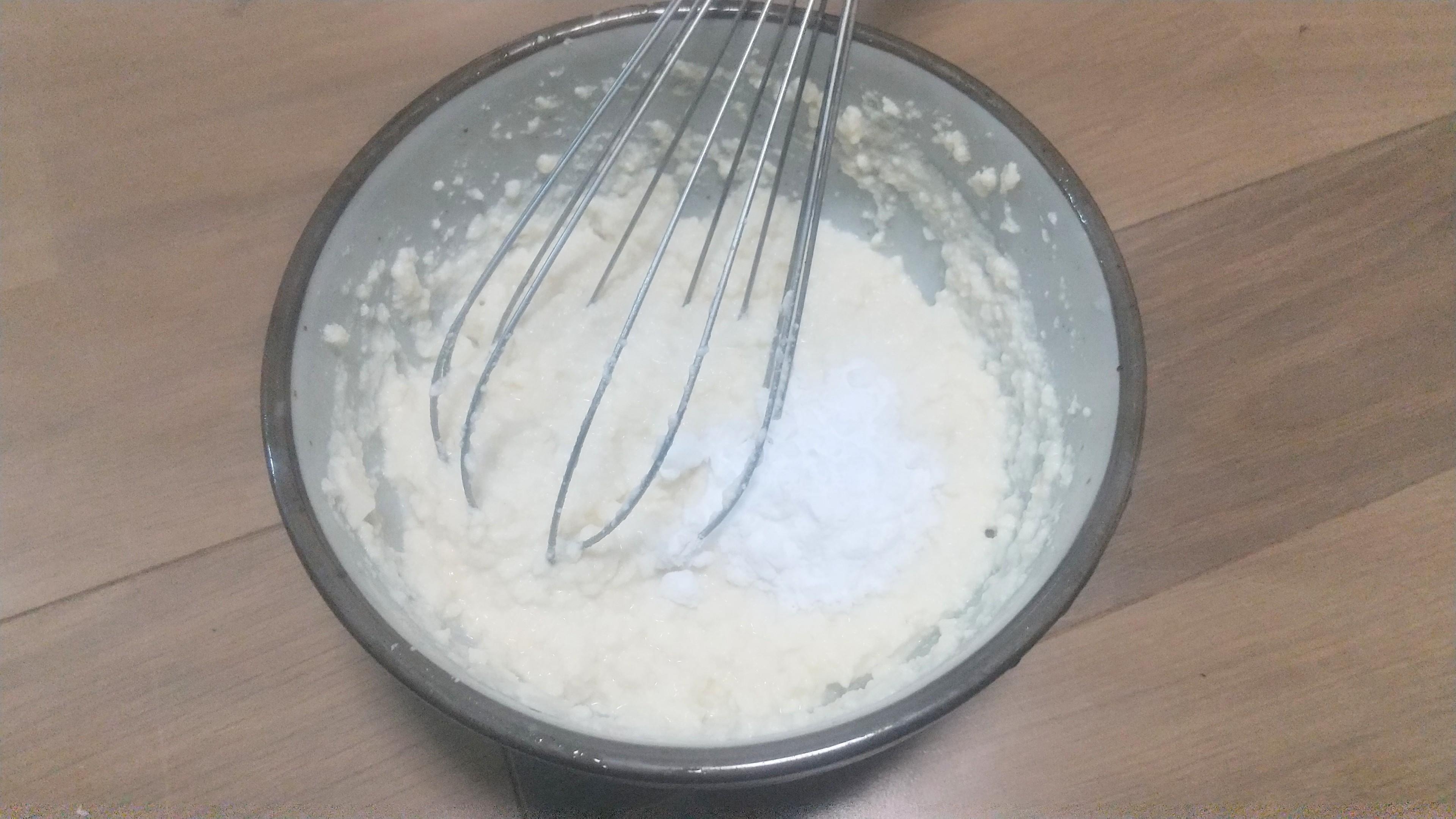 出来上がったお豆腐に片栗粉を投入し混ぜる。