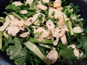 ローストチキンをのせ、舞茸を散らし、酢と水を回し入れる。