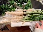 葉付き根パセリは、根、茎、葉を刻み、よく水洗いして、土を落とす。