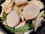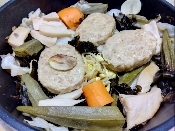 深めのフライパンに、食べよく切った人参、豆もやし、乾燥わかめ、キャベツ、オクラ、エリンギを入れ、☆を散らし、鶏つくねをのせる。