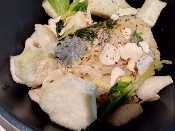 深めのフライパンに豆もやし、エリンギ、洗いらっきょう、食べよく切ったセロリ、へちまを入れ、☆を散らす。