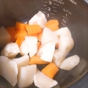 好きな野菜いれましょう!根菜は炊飯器ではなく電子レンジでもOKです。柔らかくなればなんでも!