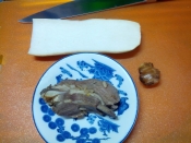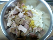 主な材料の写真です。スペアリブは昨日おかずの残り。生でもできるが、調理済みのものの方が扱いやすい。量は片手に乗るくらいひとかたまり。