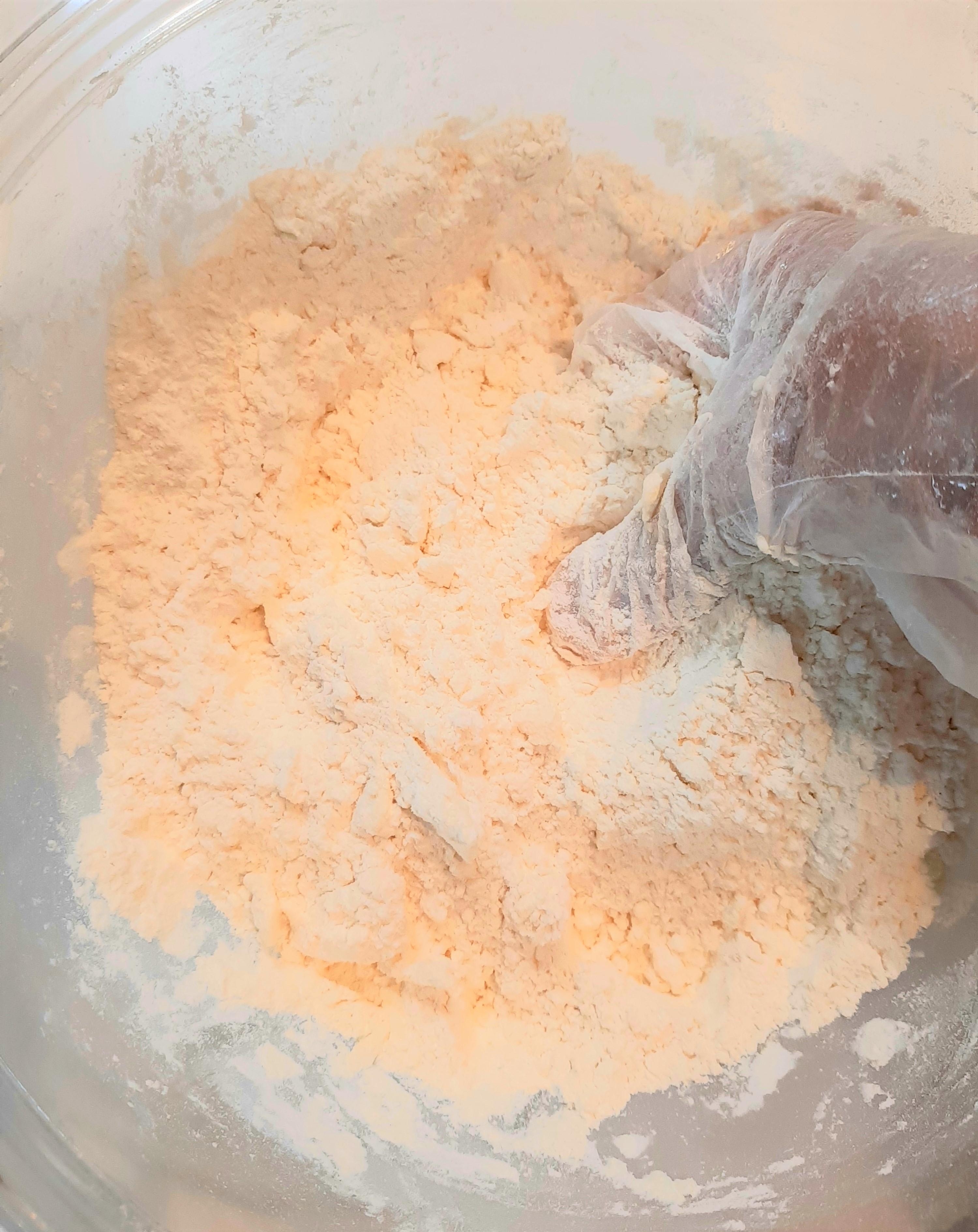 粉を混ぜる。●の粉類をボウルに入れてぐるぐる混ぜる(ホイッパーか手で)