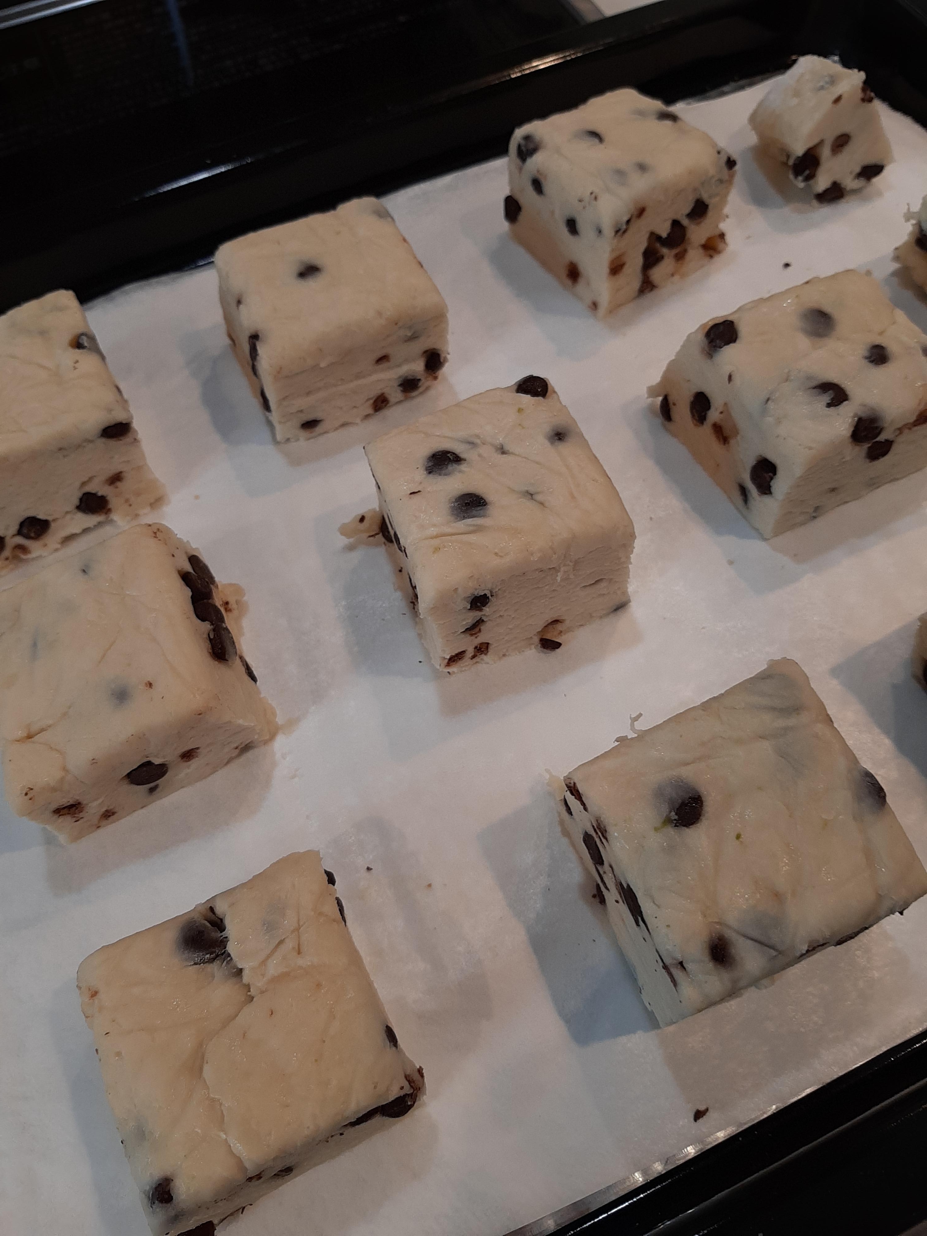 焼く。生地を正方形や長方形にカットし、オーブンシートを敷いた天板にのせ、220℃余熱したオーブンで15分焼く。