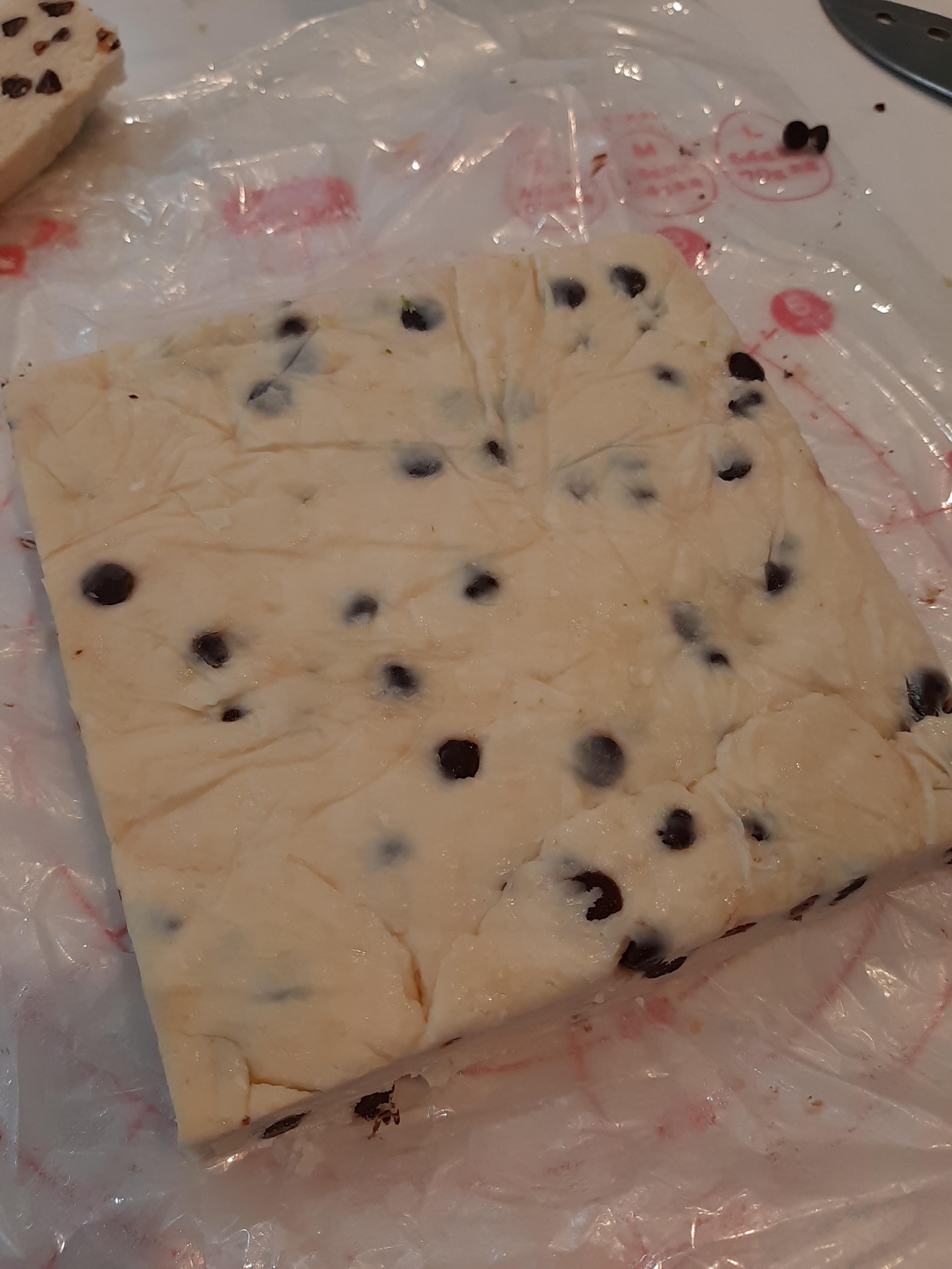 牛乳、クルミ、チョコチップを加えて混ぜ、ひとまとめにする。練らないようにします。※写真は、抹茶バージョンで作ったものです。