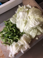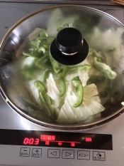 しばらく炒めたらキャベツの葉部分・ピーマンを加えて蓋をし、弱火で3分蒸し焼きにします。