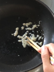 フライパンにサラダ油・おろしニンニクを入れ、弱火で香りがたつまで炒めます。