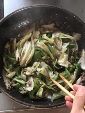 ちょっとだけ残っていたひき肉と冷蔵庫にあったキャベツとピーマンでご飯のおかずになるしっかり味のものを作ろうと、オイスターソースとマヨネーズで炒め物にしました。