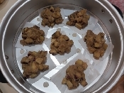 6の生地を6~7等分にして、クッキングシートを敷いた蒸し器に入れて、強火で13分ほど蒸す。