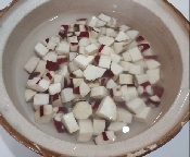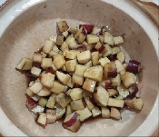 皮をむいたサツマイモを1㎝弱四方くらいに切り、ボウルに入れて水でさっと洗い、アクを取る。(皮を少し残すと色合いがきれい)