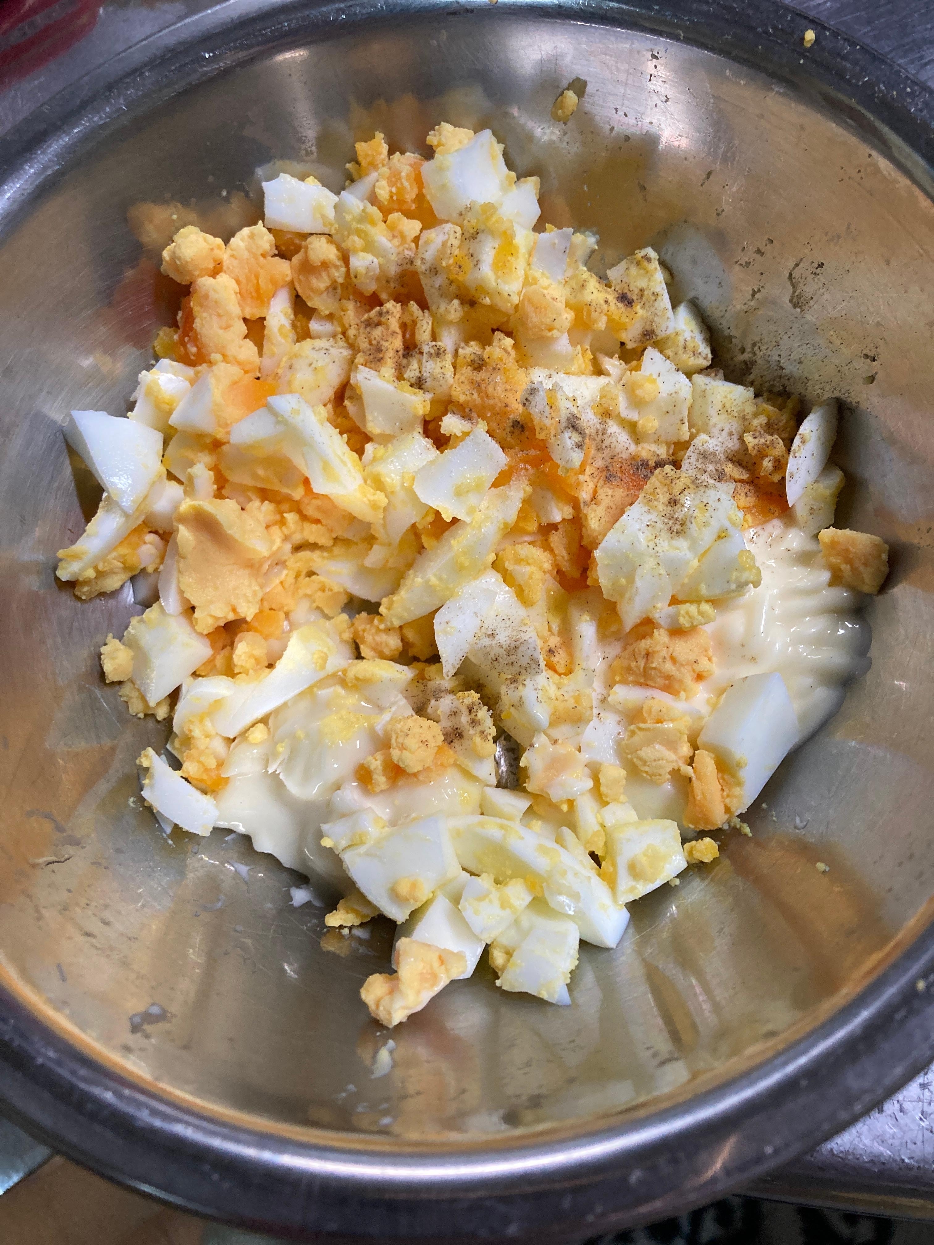 - 塩コショウ 少々ゆでたまごは荒く刻み、ボウルに入れて
