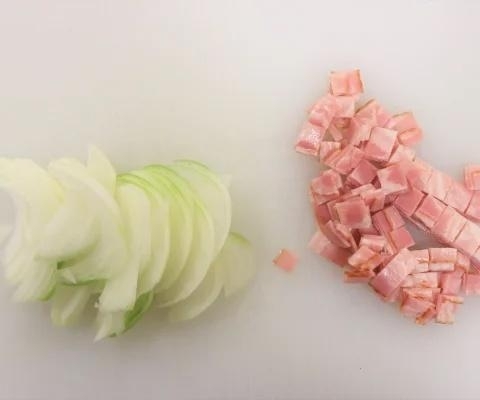 玉ねぎは薄切りにし、ベーコンはひと口大に切ります。