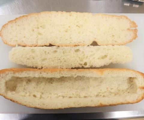 バゲットの上1/4を切り、中身をくり抜きます。※くり抜いたパンは付け合わせとして使用してもOK。
