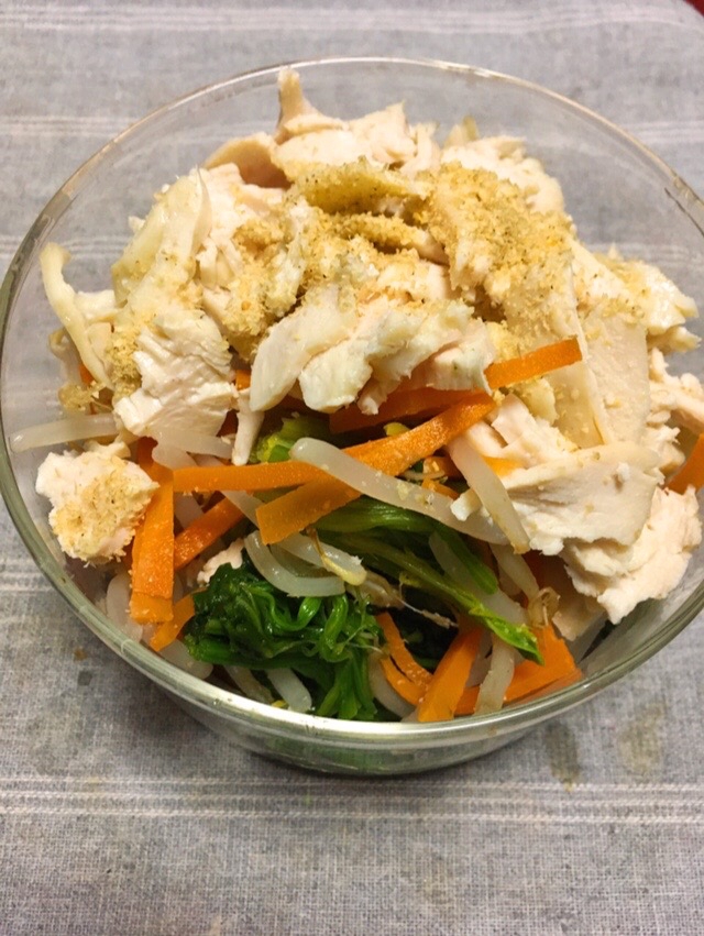1を包丁で切ったあと手で細かく割き、ほうれん草、ニンジン、もやし、★を加えよく混ぜ合わせたら完成!
