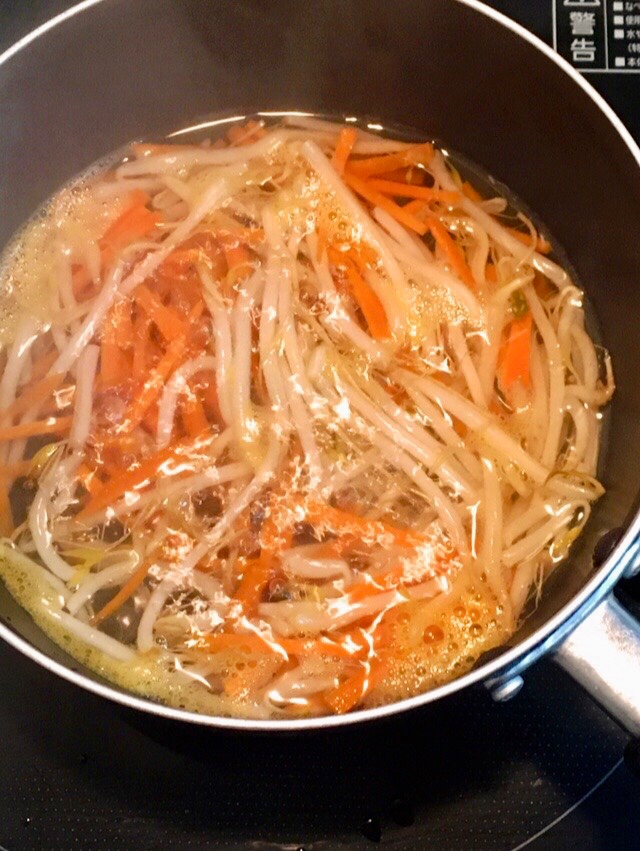 細切りにしたニンジンともやしを茹で水にさらしたら、手でギュッと絞り水気をよく切ります。