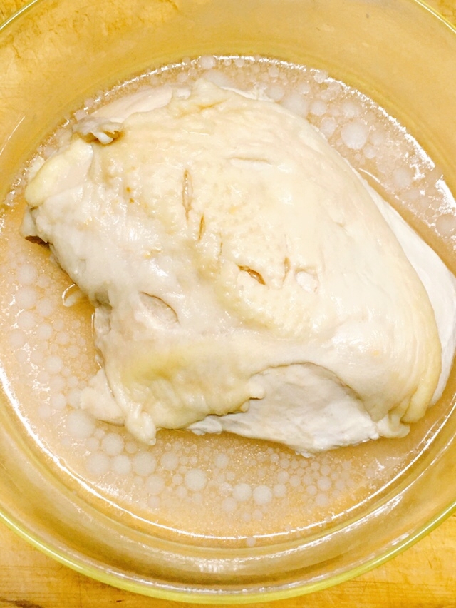 鶏むね肉は皮目に包丁の先などで数カ所穴を開け☆を加え馴染ませます。ラップをしてレンジ600Wで4分程加熱し、粗熱が取れるまでラップをしたまましばらく置きます。