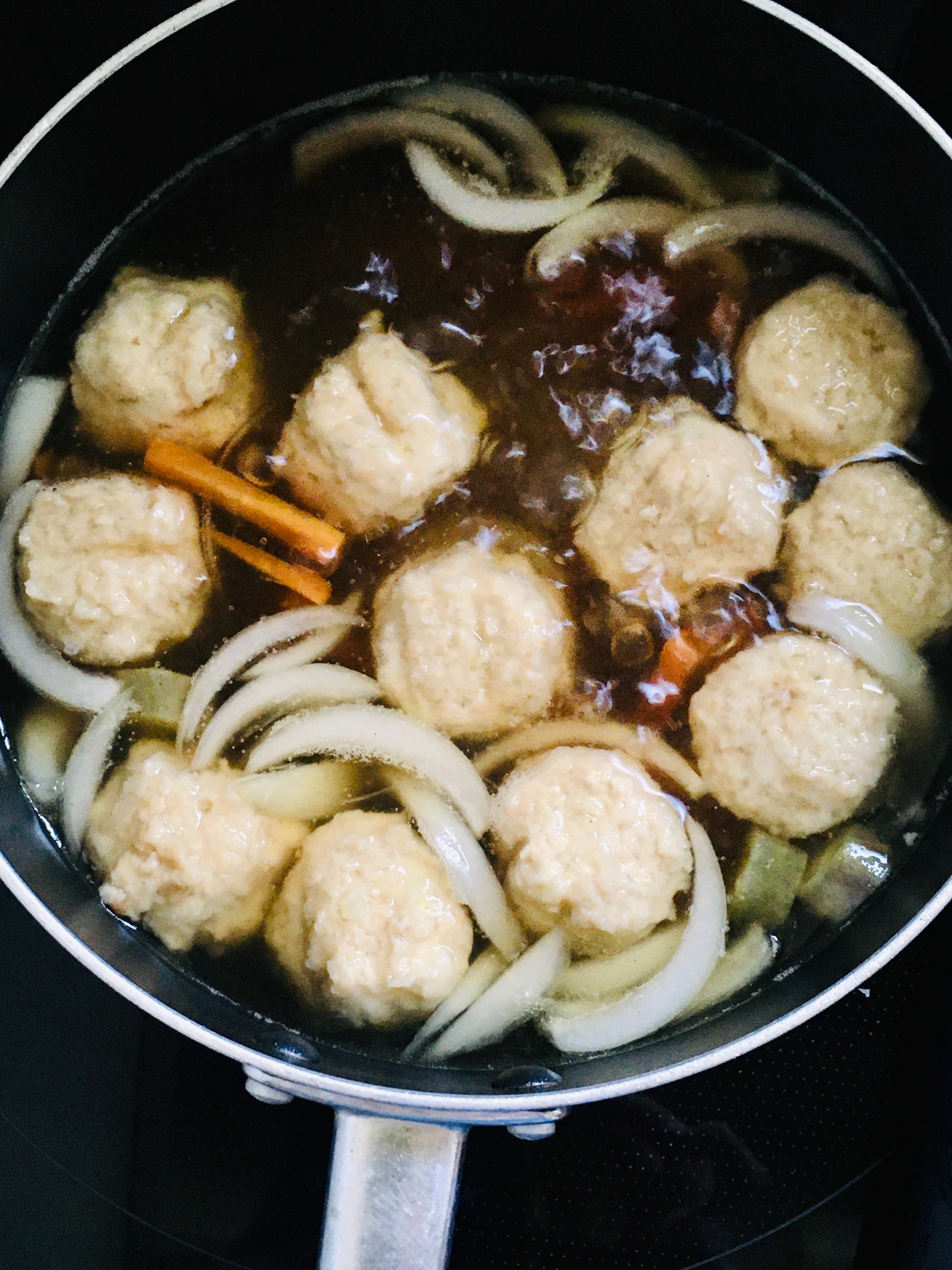鍋に★を入れ、沸騰したら冷凍肉だんご、にんじん、玉ねぎ、マロニーを加え煮ます。