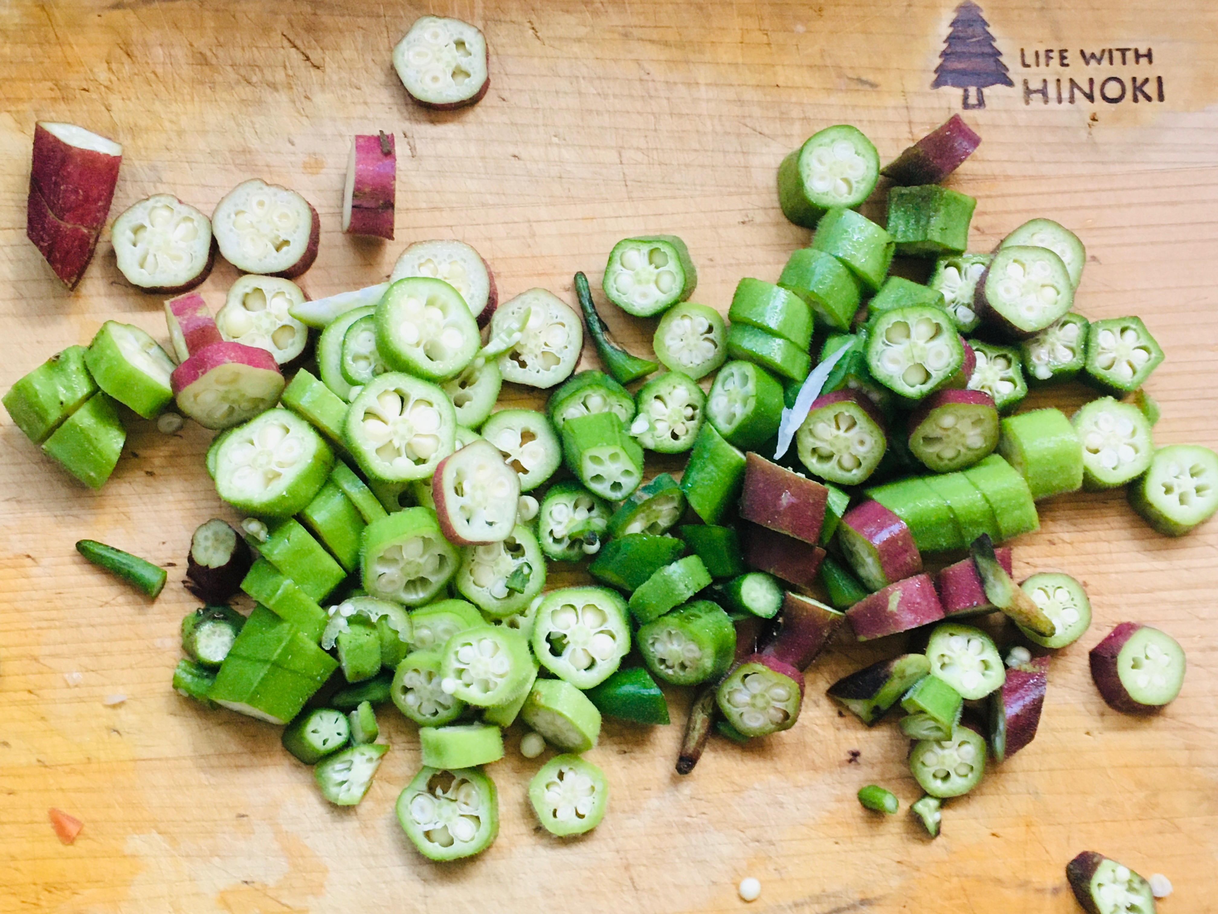 オクラはヘタを取って小口切り、にんじんは短冊切り、玉ねぎはくし切りにします。