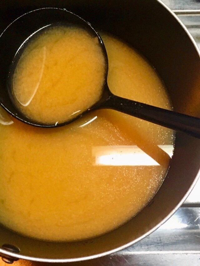 温めたかつお出汁に味噌を溶きます。